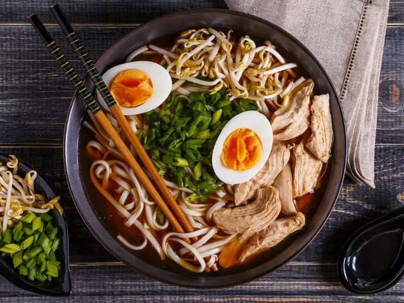 Macarrão japonês servido em um caldo quente e saboroso, com pedaços de frango, cogumelos, cebolas verdes e um ovo cozido marinado. Ideal para aquecer os dias frios.